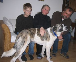 die sanfte Mastin Espanol-Mischlingshündin hat ein sehr schönes Zuhause bei einer netten hundeerfahrenen Familie mit Haus und Grundstück gefunden. Auch mit dem 11-jährigen Sohn der Familie versteht sie sich prima. Ihre neuen Besitzer haben sich im Vorfeld gründlich über Herdenschutzhunde und deren Verhalten informiert, wissen auch, dass Donas Wachtrieb noch zunehmen kann. Sie wird auch weiterhin viel Kontakt zu anderen Hunden haben und auch die Hundeschule besuchen. Dona ist nun endlich volles Familienmitglied. Darauf hat sie zwei Jahre warten müssen. |