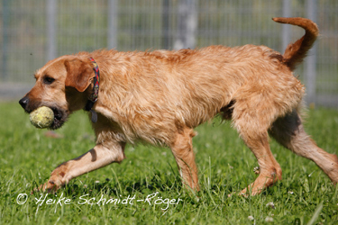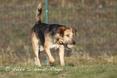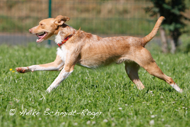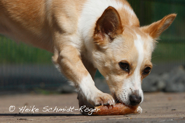 Canela die kleine 8 Monate alte Mischlingshündin hat das Tierheim nach einer Woche wieder verlassen. Sie ist zu einem jungen Paar gezogen und leistet nun einem Labradorrüden Gesellschaft. Die beiden Hunde verstehen sich prima, toben wunderbar miteinander. Da die Eltern bzw. Schwiegereltern in einem Haus mit großen Garten direkt gegenüber wohnen und alle zu verschiedenen Zeiten arbeiten gehen, müssen die beiden Hunde nie alleine sein. Die pfiffige Hündin wird mit vielerlei Spielen und auch mit Hundesport beschäftigt. |