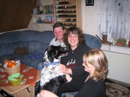 die schöne English Setter Hündin ist zu einem sehr netten Rentnerehepaar in ein schönes Haus mit Garten gezogen. Sie fühlt sich dort sichtlich wohl und ihre Besitzer sind ebenfalls sehr glücklich mit der freundlichen Hündin, deren einzige Macke es ist, vom Tisch zu klauen, wenn sich die Gelegenheit bietet. Aber auch das wird ihr verziehen. Sie muss nie alleine sein und Sydney hat mit diesem schönen Zuhause nun endgültig ihr Glück gefunden. |